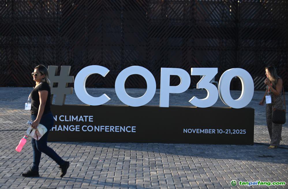 2025年11月4日,在巴西北部帕拉州貝倫市,行人從貝倫城市公園外《聯(lián)合國氣候變化框架公約》第三十次締約方大會(COP30)的標(biāo)識前經(jīng)過。新華社發(fā)(盧西奧·塔沃拉攝) 本`文@內(nèi)-容-來-自;中_國_碳排0放_交-易=網(wǎng) t an pa ifa ng . c om