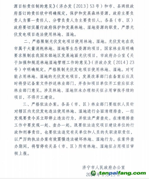 為了有效保護林地和濕地資源,規(guī)范林業(yè)用地秩序,嚴厲打擊違法用地行為,《通知》指出光伏發(fā)電在我市屬于大量消耗林地、濕地等生態(tài)資源的項目,要嚴格按照國家林業(yè)局明確要求限制在東部地區(qū)發(fā)展地面光伏項目和《關(guān)于加強和規(guī)范林地濕地管理工作的意見》(濟政辦發(fā)〔2014〕23號)規(guī)定,嚴格限制光伏發(fā)電項目使用林地、濕地,對可能占用林地、濕地的光伏發(fā)電項目,項目單位在開工前應(yīng)征求林業(yè)部門意見。涉及林地、濕地但未辦理征占用手續(xù)的項目,不得開工建設(shè)。