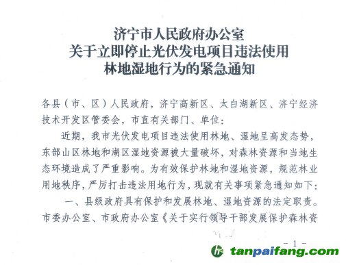 近日,濟寧市政府辦公室下發(fā)了《關(guān)于立即停止光伏發(fā)電項目違法使用林地濕地行為的緊急通知》(以下簡稱《通知》),對全市光伏發(fā)電項目使用林地、濕地行為進行規(guī)范管理。 本`文@內(nèi)-容-來-自;中_國_碳排0放_交-易=網(wǎng) t an pa ifa ng . c om
