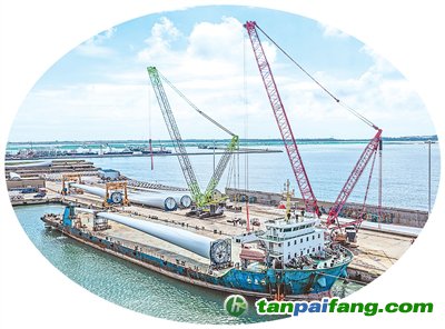 在山東省榮成市石島管理區(qū)的海上風(fēng)電產(chǎn)業(yè)基地,超大型風(fēng)電葉片正在吊裝和運(yùn)輸,準(zhǔn)備運(yùn)往海上作業(yè)區(qū)進(jìn)行安裝。李信君攝(人民視覺)