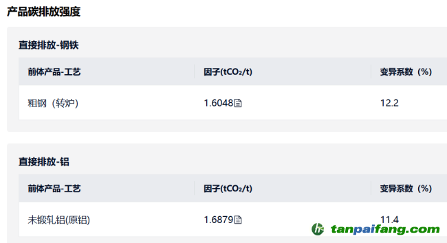 國家溫室氣體排放因子數據庫中,粗鋼(轉爐)、未鍛軋鋁(原鋁)產品碳排放強度數據如下: