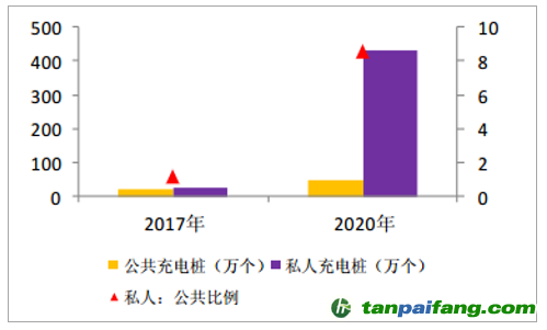 縱觀國內(nèi)充電樁市場,私人充電樁可謂占據(jù)了半壁江山:截至 2017 年底,我國的充電樁保有量達 45 萬個。其中,公共類充電樁 21 萬個,私人類充電樁 24 萬個。 私人充電樁即用戶為滿足自身車輛需要自行在小區(qū)內(nèi)投資建設(shè)的充電樁。2020 年私人充電樁的市場規(guī)模將達到 39.82 億元。 而從數(shù)量比來看,根據(jù)《電動汽車充電基礎(chǔ)設(shè)施發(fā)展指南(2015-2020)》 對 2020 年的規(guī)劃來看, 2020 年私人充電樁數(shù)量將達到 430 萬而公共充電樁數(shù)量為 50 萬個,其比例約為 8.60,遠遠高于 2017 年 1.14的比例。因此,私人充電樁市場大有可為。 本@文$內(nèi).容.來.自:中`國`碳`排*放^交*易^網(wǎng) t a np ai fan g.c om