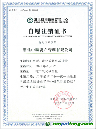 中碳資管自愿注銷(xiāo)1噸湖北碳普惠減排量,用于抵消本次綠色發(fā)展論壇產(chǎn)生的碳排放量,率先實(shí)現(xiàn)論壇碳中和目標(biāo),為綠色會(huì)議舉辦樹(shù)立示范樣板。 禸*嫆唻@洎:狆國(guó)湠棑倣茭昜蛧 τāńpāīfāńɡ.cōm