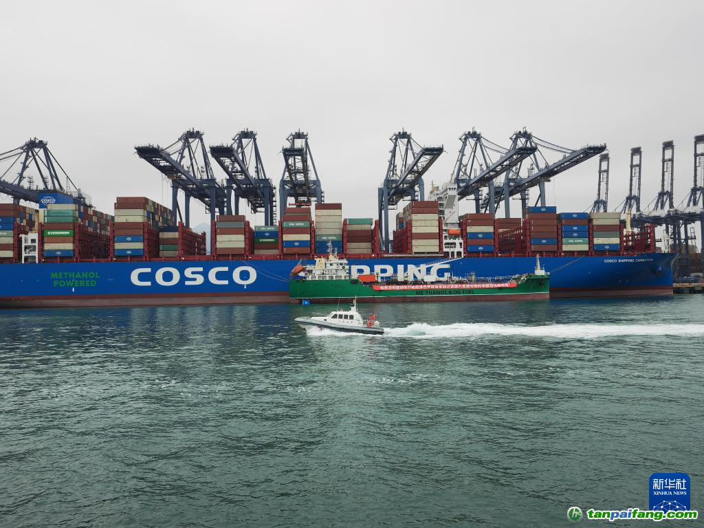 1月21日,雙燃料甲醇加注船“大慶268”輪在深圳港鹽田港區(qū)為“中遠海運康乃馨”輪加注綠色甲醇燃料。新華社記者 王豐 攝 本文`內(nèi)-容-來-自;中_國_碳_交^易=網(wǎng) tan pa i fa ng . c om