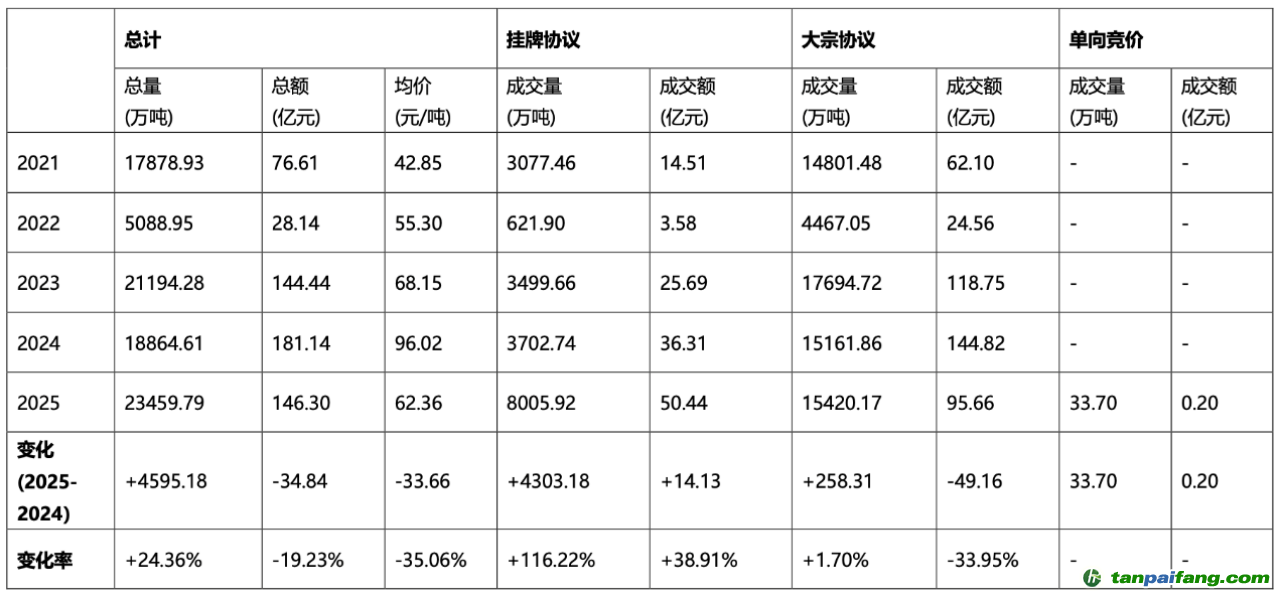 2025年,全國碳市場在頂層部署和制度建設(shè)上取得關(guān)鍵進(jìn)展?!蛾P(guān)于健全資源環(huán)境要素市場化配置體系的意見》《關(guān)于推進(jìn)綠色低碳轉(zhuǎn)型加強(qiáng)全國碳市場建設(shè)的意見》等中央文件明確了碳市場建設(shè)的階段性目標(biāo)、覆蓋范圍、配額管理和多市場協(xié)同方向,全國碳市場首次擴(kuò)圍至鋼鐵、水泥、鋁冶煉行業(yè),年度運(yùn)行安排與配額分配清繳等規(guī)則進(jìn)一步明確,交易方式也在單向競價(jià)等方面實(shí)現(xiàn)創(chuàng)新。市場交易規(guī)模繼續(xù)擴(kuò)大,2025年全國碳市場成交量2.35億噸,同比增長24.36%;成交額146.30億元,同比下降19.23%;成交均價(jià)62.36元/噸,較2024年回落35.06%。交易結(jié)構(gòu)上,掛牌協(xié)議成交占比顯著提升,交易節(jié)奏仍呈現(xiàn)履約期集中特征。 內(nèi).容.來.自:中`國`碳#排*放*交*易^網(wǎng) t a np ai f an g.com