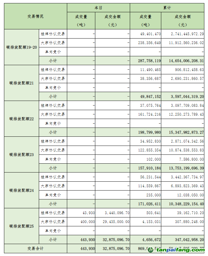 截至今日,全國(guó)碳排放權(quán)交易市場(chǎng)累計(jì)成交總量869,998,518噸,累計(jì)成交總額58,047,505,209.77元。