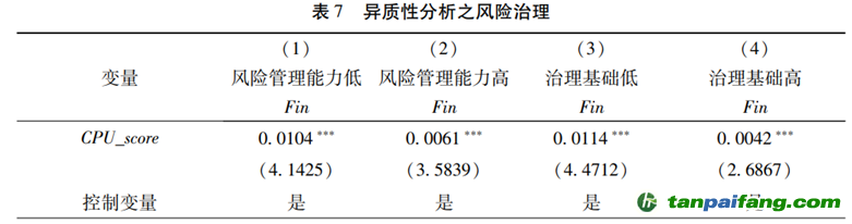 即使所面臨的風險疊加程度相同,當企業(yè)自身的風險治理水平相異時,其受氣候政策不確定性的沖擊程度也有所不同。為此,本文從風險管理能力及治理基礎(chǔ)兩個維度對企業(yè)風險治理加以考察.如表7所示,在風險管理能力較高以及內(nèi)部治理基礎(chǔ)較好的企業(yè)組中,CPU_score的回歸系數(shù)和顯著性水平相對較小,驗證了本文的研究假設(shè),即良好的風險治理有助于緩解氣候政策不確定性所誘發(fā)的企業(yè)“脫實向虛”現(xiàn)象。 本+文內(nèi).容.來.自:中`國`碳`排*放*交*易^網(wǎng) ta np ai fan g.com